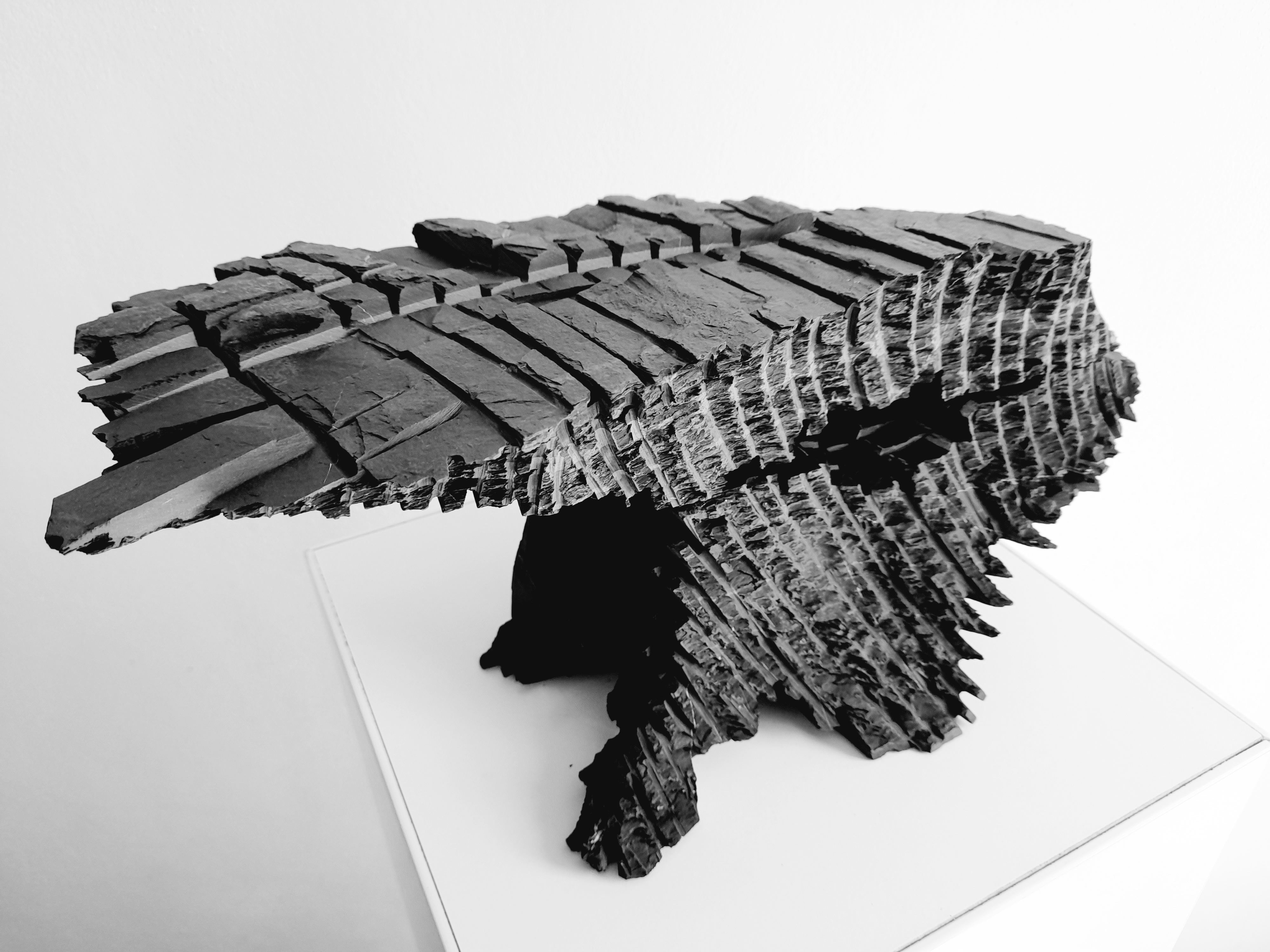 Den Titel der Skulptur IN TEMPORE habe ich gewählt weil er die Situation und meine Gedanken während der Bearbeitung von Schiefer am besten definiert. TEMPORE ist der lateinische Begriff für Zeit und IN TEMPORE beschreibt die gegenwärtige Zeit, den Moment. Viele kennen Schiefer nur als Dachschiefer oder als dünne Platten, der sich schnell in einzelne Schichten auflösen kann und generell sehr fragil ist. Die Herausforderung an die Bearbeitung von Schiefer, besteht darin, sich auf die stark ausgeprägte Schichtung, seiner Neigung sich aufzuspalten und die sich daraus ergebenden Schwierigkeiten in der Bearbeitung im Moment einzulassen und immer wieder sehr schnell auf die Veränderung der Form erneut zu reagieren und die Zweidimensionalität des Materials in einer Skulptur immer wieder neu zu denken. Schiefer entzieht sich fast jeder skulpturalen Vorstellung von Formbarkeit und er lässt sich nichts aufzwingen. Er hat mir gezeigt die Akzeptanz des Scheiterns zuzulassen und neue bildnerische Ansätze aufzugreifen. Diese Skulptur in Ihrer Form, empfinde als eine Symbiose von mehreren Eigenschaften: ein Verständnis der Komplexität des Materials, der Akzeptanz des Scheiterns, im richtigen Moment aufzuhören und in der Skulptur dem Wesen des Materials Lebendigkeit einzuhauchen.