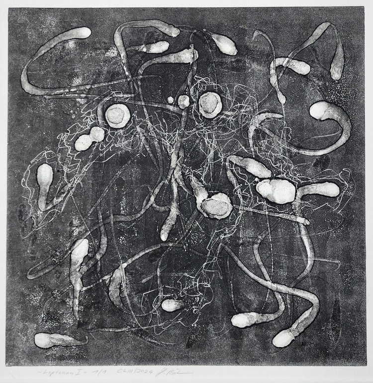 Werkserie LEPTONEN 2024 Unikat / Monotypie auf Büttenpapier/ Grafik 50×50 cm mit Passepartout